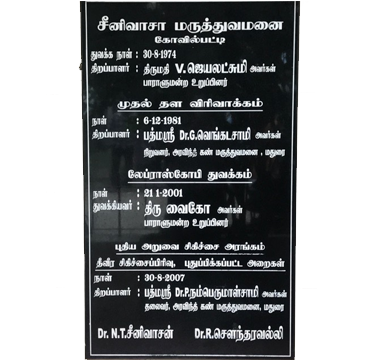 This hospital started as a General clinic in 1974 with 5 beds and now developed into a multi speciality hospital with 30 beds run by DR.N.T.SRINIVASAN, MS.,FICS,FAIS,FAES., and DR.R.SOUNDARAVALLI, MBBS.,. The Hospital is located in the heart of the town in Kovilpatti. 33 cents area with Built up area of 10,000 Sq ft, Round the clock service to the people.